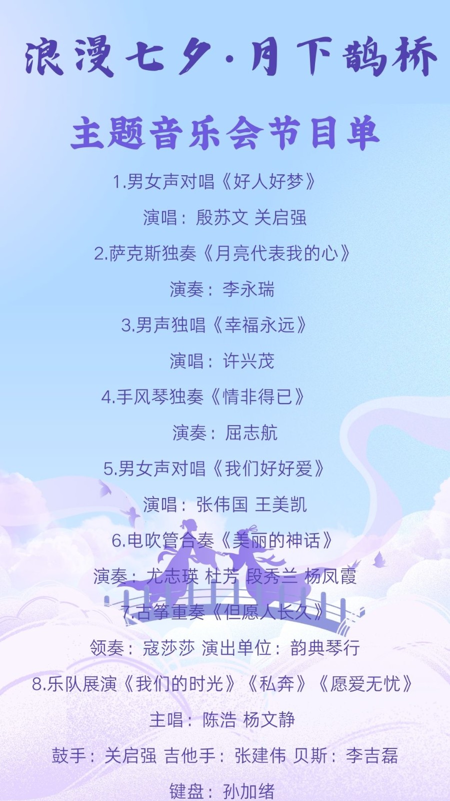 七夕佳节,这个承载着牛郎织女唯美传说的浪漫节日,又一次翩然而至。在这个爱意弥漫的日子里,一场以“浪漫七夕月下鹊桥”为主题的音乐会,将于8月29日晚在月牙湖公园浪漫举行。届时,舞台上将汇聚一众实力唱将与知名乐队 。他们将用或深情款款,或激昂澎湃的歌声,演绎一首首…