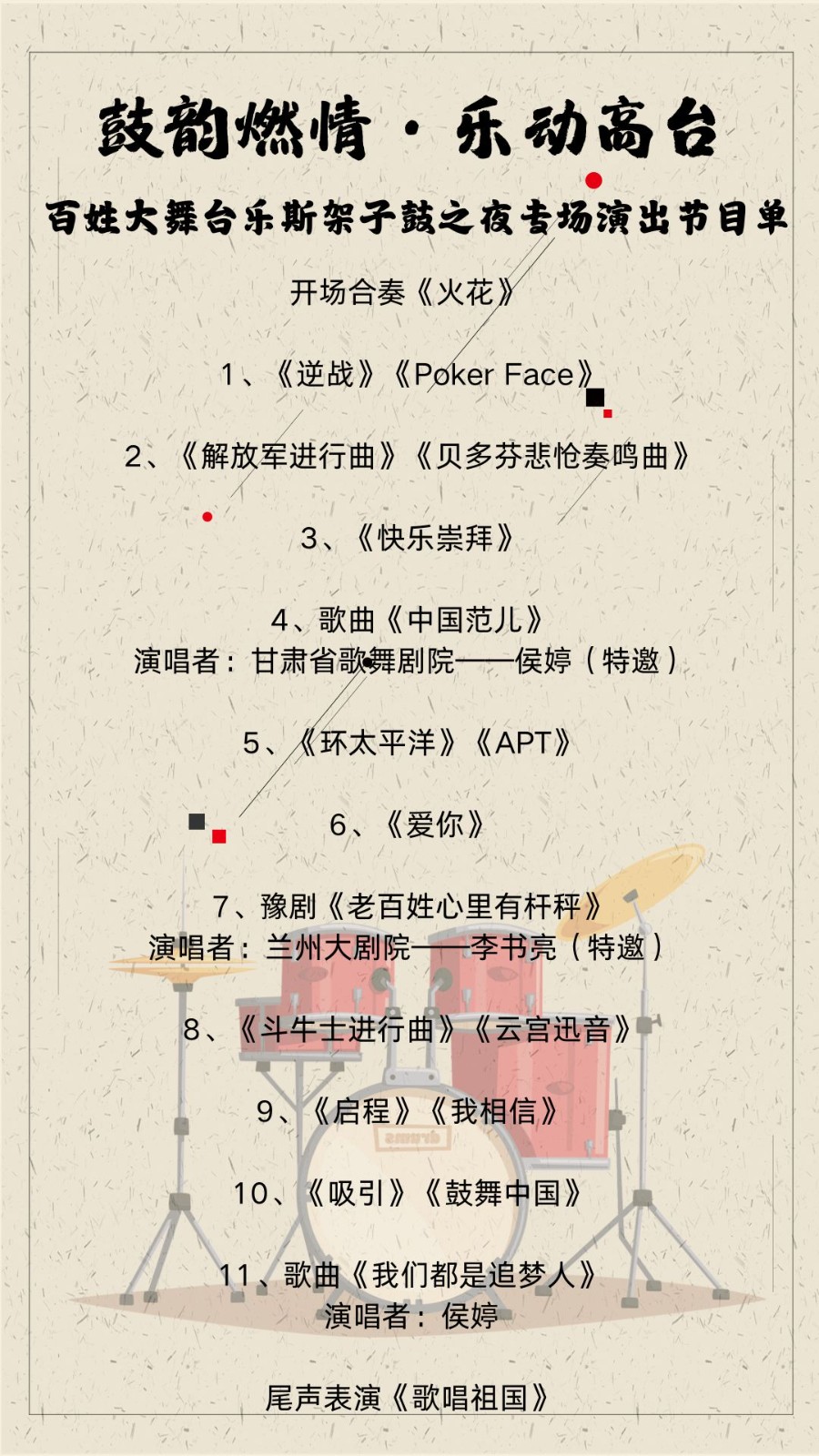 为隆重庆祝中华人民共和国成立75周年,热情讴歌党的光辉历程,大力弘扬以爱国主义为核心的民族精神,激发广大人民群众爱国热情,充分调动基层群众文艺创作和演出的积极性、主动性,营造健康向上的良好社会氛围。由中共张掖市委宣传部、张掖市文化广电和旅游局、高台县人民政府…