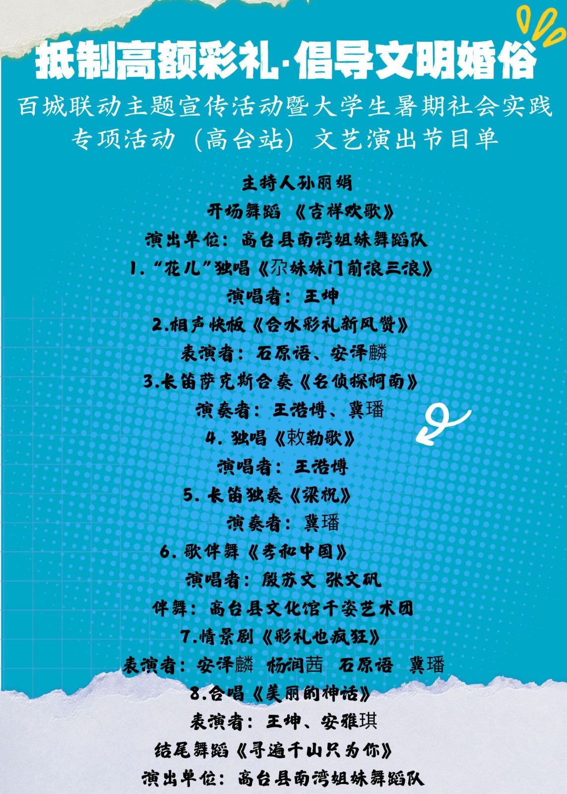 为积极响应移风易俗号召,弘扬文明新风尚,“抵制高额彩礼倡导文明婚俗”百城联动主题宣传活动暨大学生暑期社会实践专项活动(高台站)文艺演出,拟定于8月16日(周六)晚八时在水之印广场盛大开启。活动现场,大学生们将带来一系列精彩纷呈的节目,如快板、情景剧、器乐演奏、…