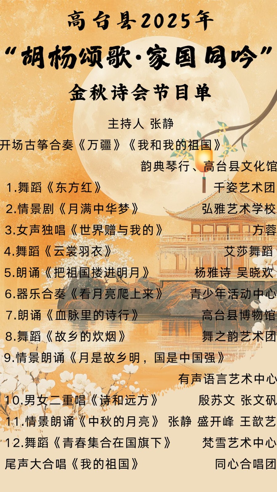 月满胡杨,诗颂家国。高台县2025年“胡杨颂歌家国同吟”金秋诗会将于10月1日晚(中秋前夕) 在水之印广场温情启幕,诚邀诗词爱好者共赴诗意之约。此次活动节目形式丰富多样,涵盖器乐演奏、朗诵、歌曲、舞蹈、情景剧表演等多种艺术形式,现场穿插诗词接龙、知识问答等互动游戏…