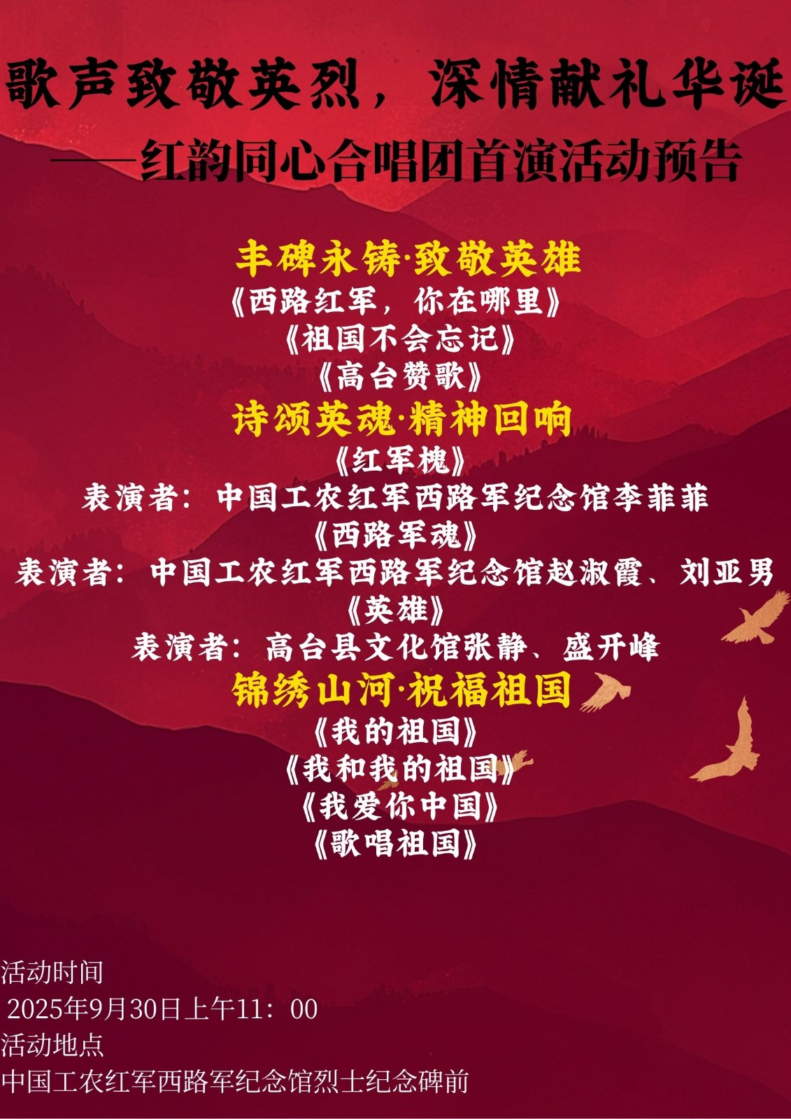为深切缅怀革命英烈、迎接中华人民共和国成立76周年华诞,红韵同心合唱团将于9月30日上午,在中国工农红军西路军纪念馆烈士纪念碑前举办“歌声致敬英烈,深情献礼华诞”主题首演活动,用经典旋律传递红色信仰,为观众带来一场兼具思想性与艺术性的视听盛宴。本次首演以“致敬英…